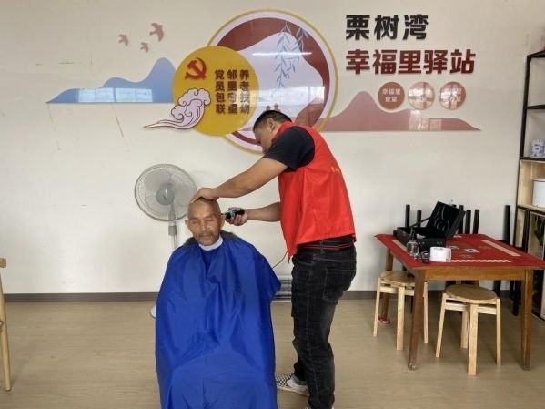 荊門市東寶區(qū)栗溪鎮(zhèn)栗樹灣村留守老人在“養(yǎng)老服務(wù)驛站”享受免費理發(fā)服務(wù)