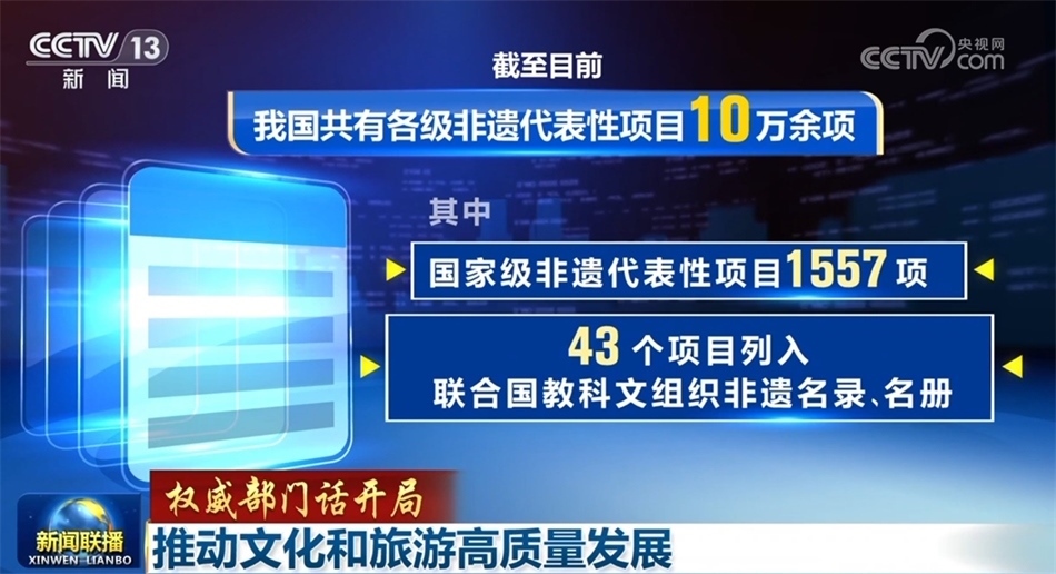 繁榮發(fā)展文化事業(yè)和文化產(chǎn)業(yè),推進城鄉(xiāng)公共文化服務體系提質增效。今年前11個月,文化和旅游部主辦27項展演展示活動,線下觀眾90萬人次,線上觀看量超過18億次,一批彰顯中華審美風范、富有鮮明時代氣息的舞臺藝術作品廣受好評。保護傳承弘揚中華優(yōu)秀傳統(tǒng)文化,中華文明探源工程、考古中國等重大項目得以深入實施,截至目前,我國共有各級非遺代表性項目10萬余項,其中國家級非遺代表性項目1557項,43個項目列入聯(lián)合國教科文組織非遺名錄(名冊),中國世界遺產(chǎn)數(shù)量增至57項。