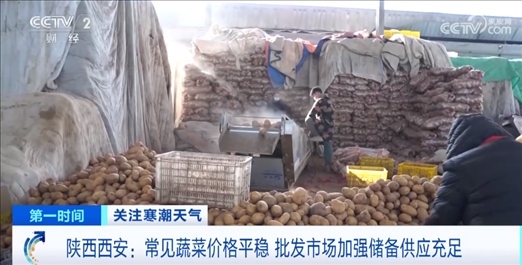 在西安一家大型農(nóng)副產(chǎn)品批發(fā)市場(chǎng),為了應(yīng)對(duì)寒潮天氣帶來(lái)的影響,常年做蔬菜批發(fā)生意的戴建軍早在土豆產(chǎn)地建起庫(kù)房,大量收購(gòu)?fù)炼?,增加運(yùn)輸車輛,確保土豆能及時(shí)運(yùn)到西安。