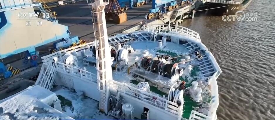 總臺央視記者 張叢婧:大家可以看到,現(xiàn)在船上掛滿了一層冰棱,非常堅硬,現(xiàn)在甲板上特別滑,走路的時候要非常注意。