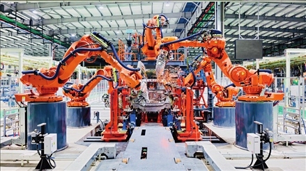 浙江清華長三角研究院新能源汽車研發(fā)中心的新能源汽車制造焊裝線(2021年6月攝)。 浙江清華長三角研究院供圖