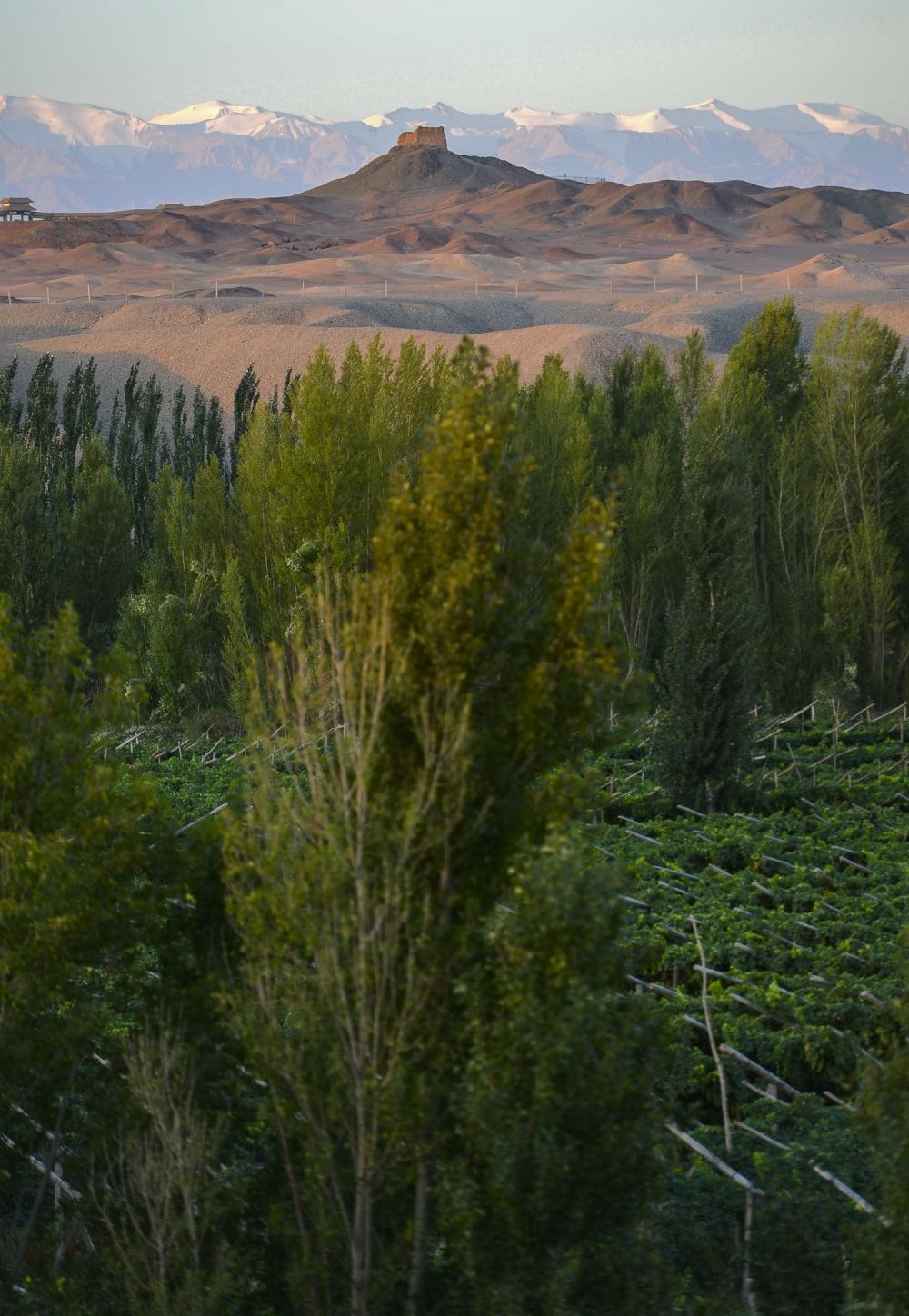 甘肅省敦煌市陽關(guān)遺址前的綠洲(2013年9月5日攝)。
