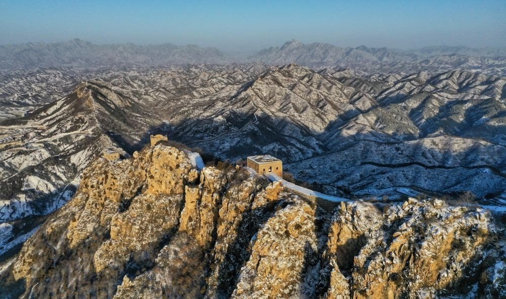 在晨曦中拍攝的雪后司馬臺(tái)長城(無人機(jī)照片,2023年2月19日攝)。