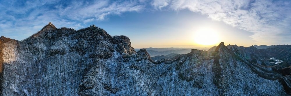 夕陽下的北京箭扣長城(無人機(jī)全景照片,2023年2月13日攝)。