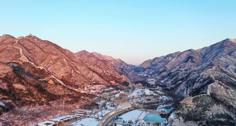 朝陽灑在雪后的居庸關(guān)長城上(無人機(jī)照片,2023年12月16日攝)。