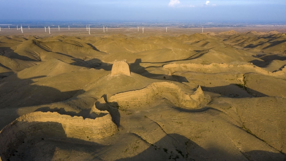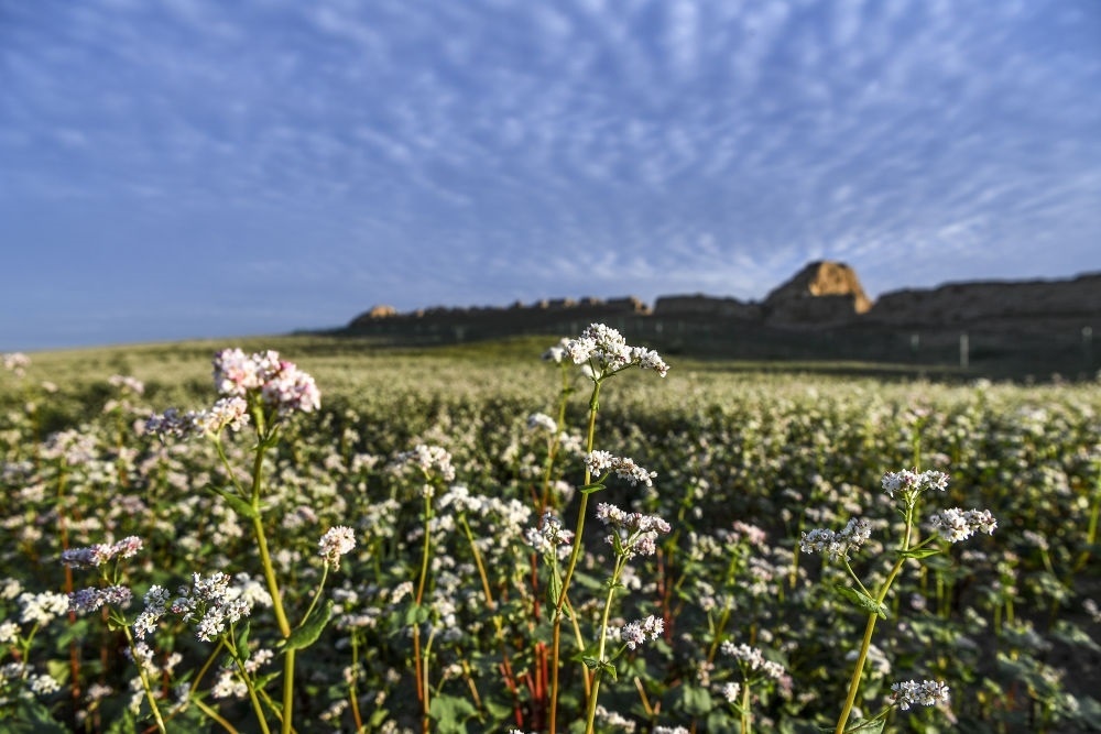寧夏吳忠市鹽池縣一處長城腳下蕎麥花開放(2023年8月18日攝)。
