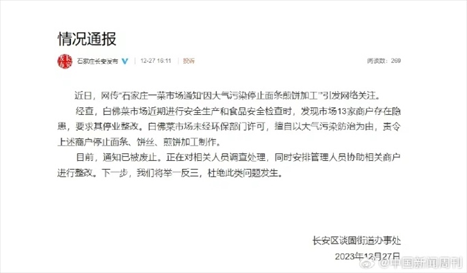 ·石家莊一菜市場通知“因大氣污染停止面條煎餅加工”?官方回應(yīng)。