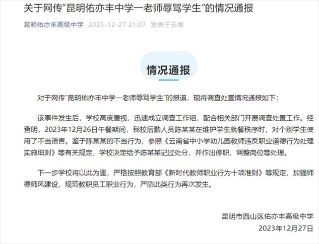 ·昆明某中學老師辱罵學生?校方通報:給予記過、停職、調(diào)整崗位等處理。