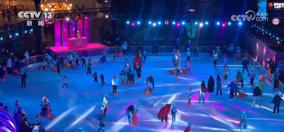 在北外灘商圈,這片占地1200平方米的露天冰場吸引了不少市民游客。人們滑冰、逛街、吃飯,還能觀看白玉蘭國際冰雪節(jié)的主題活動(dòng)和演出。