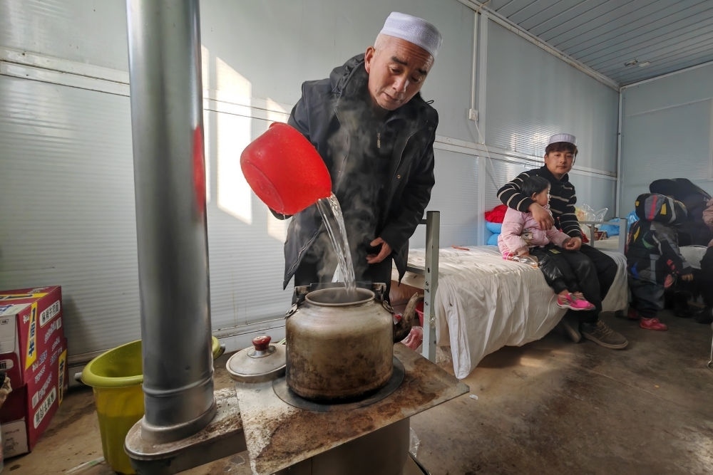 在甘肅臨夏積石山縣大河家鎮(zhèn)梅坡村活動板房安置點,受災村民在活動板房內(nèi)的火爐上燒水(12月21日攝)。新華社記者 范培珅 攝