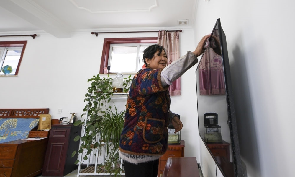 在北京市房山區(qū)佛子莊鄉(xiāng)陳家臺村,61歲的村民馬書金在修繕后的房子內(nèi)擦拭電視(12月12日攝)。新華社記者 鞠煥宗 攝