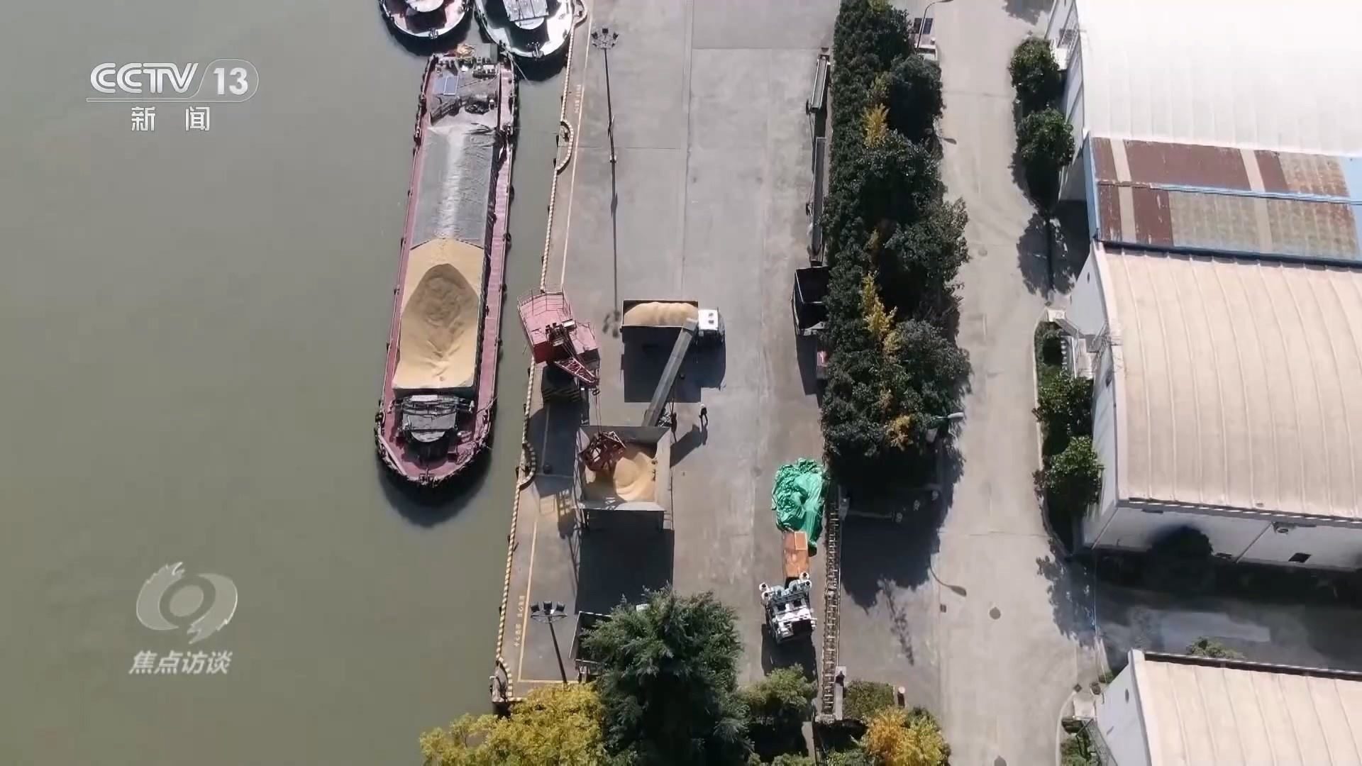 在京杭大運河浙江余杭段的這個碼頭上,貨船上的稻谷正在被轉送到貨車上。碼頭旁是浙江省糧食局直屬糧油儲備庫,稻谷將被儲存在這些倉庫里。