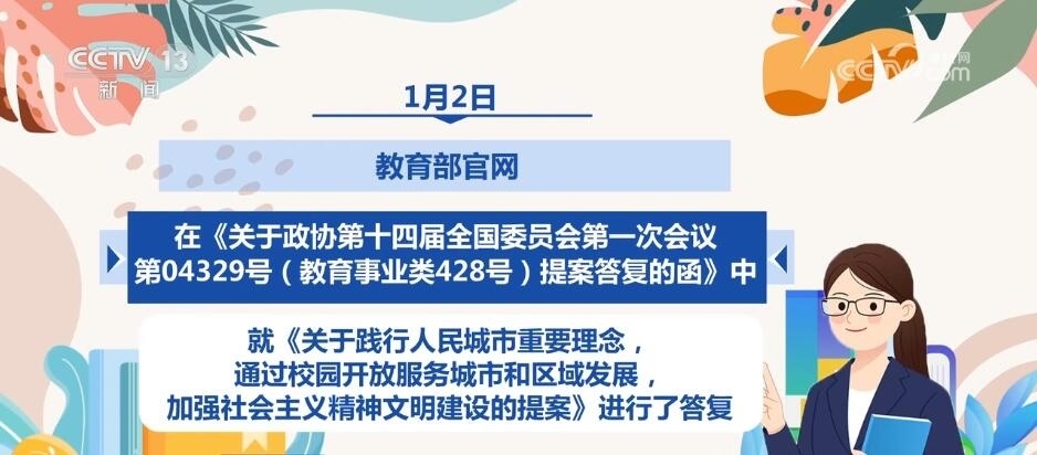 1月2日,教育部官網(wǎng)在《關(guān)于政協(xié)第十四屆全國委員會(huì)第一次會(huì)議第04329號(hào)(教育事業(yè)類428號(hào))提案答復(fù)的函》中,就《關(guān)于踐行人民城市重要理念,通過校園開放服務(wù)城市和區(qū)域發(fā)展,加強(qiáng)社會(huì)主義精神文明建設(shè)的提案》進(jìn)行了答復(fù)。
