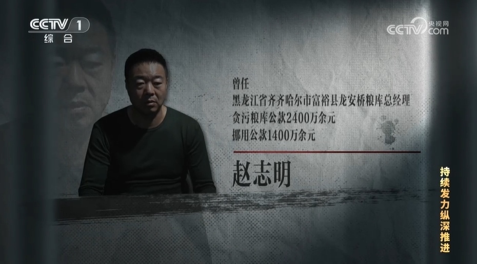 【解說詞】趙志明曾是黑龍江省齊齊哈爾市富??h龍安橋糧庫總經(jīng)理,經(jīng)查,他貪污糧庫公款2400萬余元,挪用公款1400萬余元,2023年3月被判處有期徒刑14年。龍安橋糧庫是在2015年由5家國有糧庫改革重組的,富裕縣政府持股51%、民營企業(yè)鼎倉公司持股49%。趙志明原本是鼎倉公司的老板,在這次改制中當(dāng)上了龍安橋糧庫總經(jīng)理。