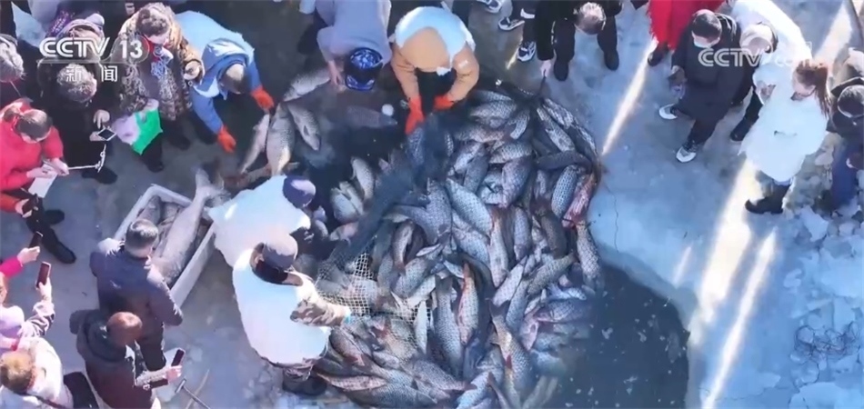 總臺記者? 阮超:我現(xiàn)在是烏梁素海的冰面上,我身邊就是此次冬捕的出魚口。隨著漁網(wǎng)緩緩拉動,水面下的魚被不斷運送到冰面上來。