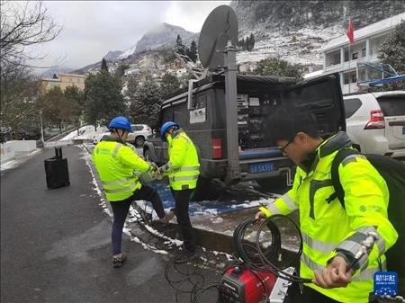 ?1月22日,工作人員在云南昭通市鎮(zhèn)雄縣山體滑坡災(zāi)害現(xiàn)場(chǎng)附近開(kāi)展工作,保障救援現(xiàn)場(chǎng)通信暢通。新華社發(fā)