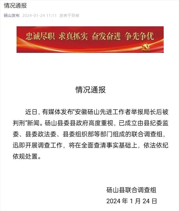 ·安徽碭山先進(jìn)工作者舉報局長后被判刑?碭山縣回應(yīng):已成立聯(lián)合調(diào)查組迅即開展調(diào)查工作,將在全面查清事實基礎(chǔ)上,依法依紀(jì)依規(guī)處置。