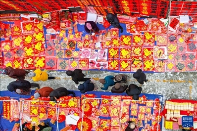 春節(jié)臨近,各地張燈結(jié)彩。人們逛花市、賞花燈、置辦年貨,年味漸濃。這是無人機拍攝的1月22日山東省青島市李村大集,人們在選購春節(jié)飾品。