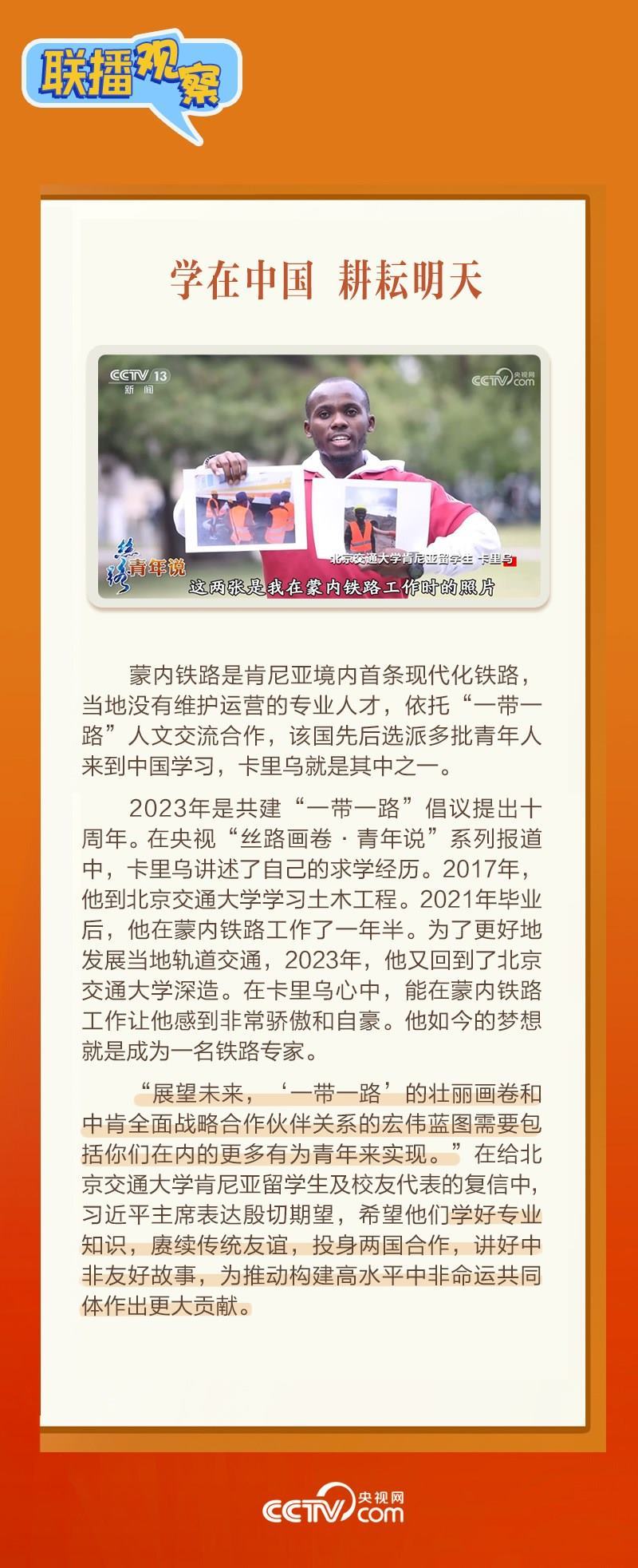 日前,北京交通大學(xué)肯尼亞留學(xué)生及校友代表致信習(xí)近平主席,表示非常高興來到中國學(xué)習(xí)鐵路運(yùn)營管理知識。1月17日,習(xí)近平主席復(fù)信表達(dá)欣慰和喜悅之情,“蒙內(nèi)鐵路是中肯共建‘一帶一路’旗艦項(xiàng)目和成功典范。我高興地看到,你們因這條‘幸福路’與中國結(jié)緣……”
