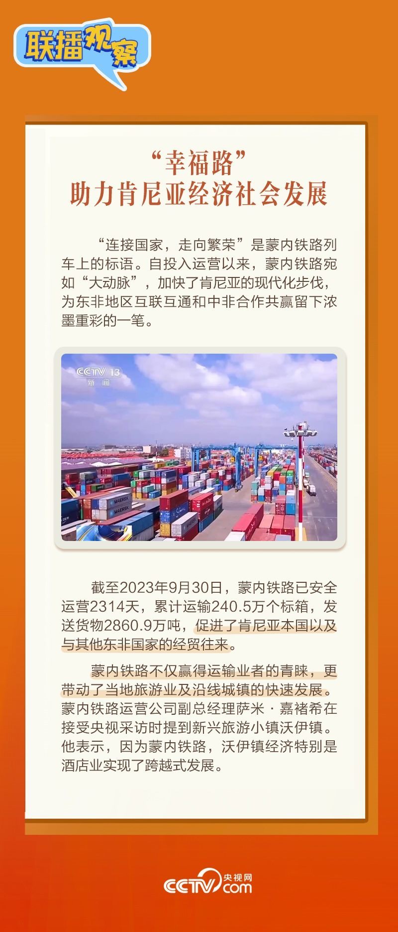 此前,習(xí)主席在外事活動中多次提及蒙內(nèi)鐵路,《新聞聯(lián)播》也持續(xù)關(guān)注這條路的建設(shè)及開通后的運(yùn)營情況。這條“幸福路”有何特別之處,習(xí)主席為何頻頻提及?它的建成通車給當(dāng)?shù)貛砟男┳兓??《?lián)播觀察》邀您一同了解。