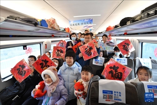 1月26日,在由南京南站發(fā)往太倉(cāng)的G8981次列車上,南京客運(yùn)段的工作人員與收到“?!弊值穆每秃嫌?。新華社記者 柳文惠 攝