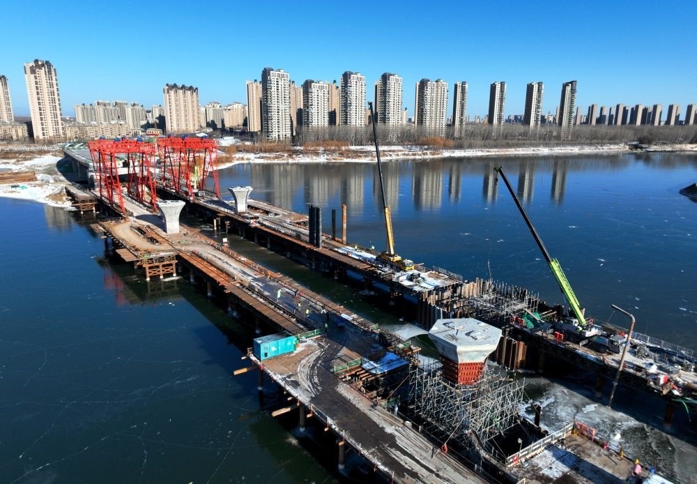 這是廠通路(河北省大廠回族自治縣至北京市通州區(qū))潮白河大橋施工現(xiàn)場(2023年12月21日攝,無人機(jī)照片)。新華社記者 王曉 攝