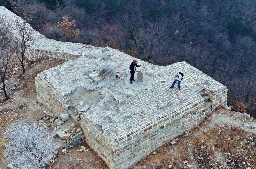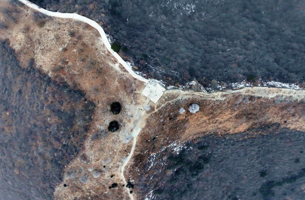 這是位于北京平谷、天津薊州、河北承德交界處的三界碑,以長城和山脊為界劃分出北京、天津和河北三地(2024年1月30日攝,無人機(jī)照片)。新華社記者 趙子碩 攝