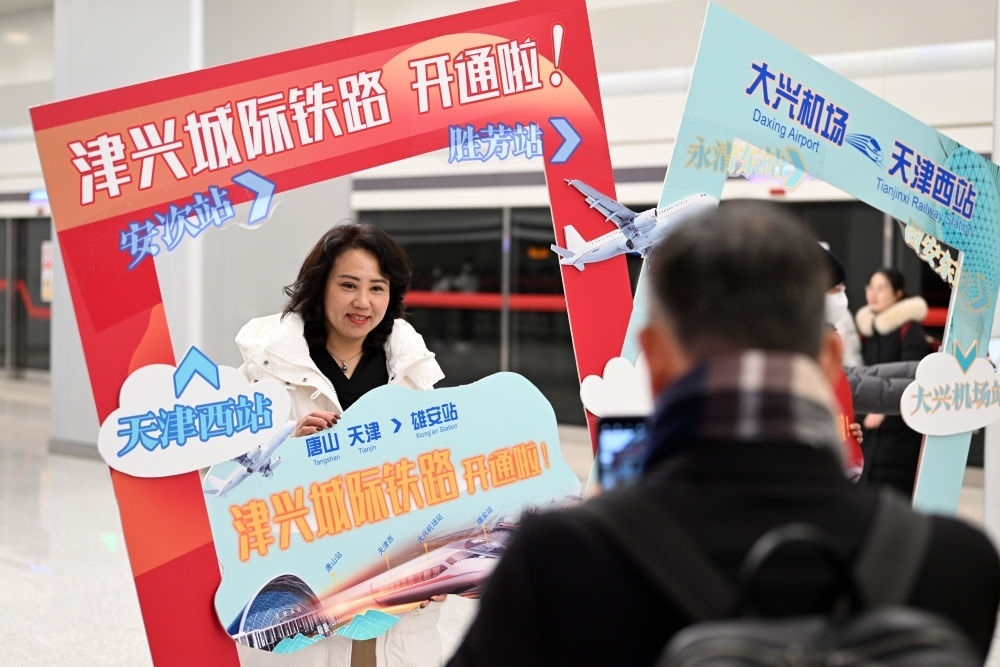 2023年12月18日,旅客在大興機(jī)場站拍照留念。當(dāng)日,津興城際鐵路正式開通運營。新華社記者 李然 攝