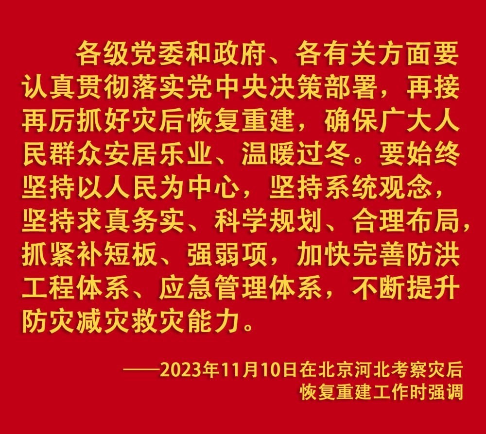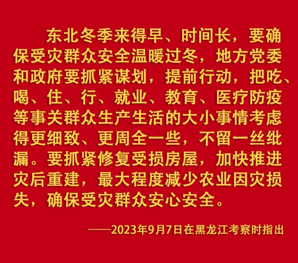 2023年汛期以來,我國(guó)華北、東北等地出現(xiàn)極端降雨,引發(fā)洪澇和地質(zhì)災(zāi)害。習(xí)近平一直牽掛著受災(zāi)群眾,高度重視防汛抗洪救災(zāi)和災(zāi)后恢復(fù)重建工作,多次作出重要指示批示,要求有關(guān)地方和部門全力保障人民群眾生命財(cái)產(chǎn)安全,盡快恢復(fù)災(zāi)區(qū)正常生產(chǎn)生活秩序。2023年9月上旬,習(xí)近平前往黑龍江尚志市看望慰問受災(zāi)群眾;11月,北方入冬之際,習(xí)近平又來到北京、河北受災(zāi)較重的相關(guān)地區(qū),看望慰問受災(zāi)群眾,檢查指導(dǎo)災(zāi)后恢復(fù)重建工作。