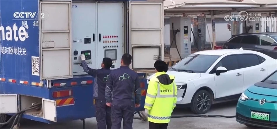 某新能源科技有限公司市場(chǎng)部經(jīng)理 霍國(guó)慶:一次可以保障四臺(tái)車,一天(一臺(tái)充電車能充)100多臺(tái)車次,再帶上這邊的固定樁,基本上能滿足保定服務(wù)區(qū)使用。