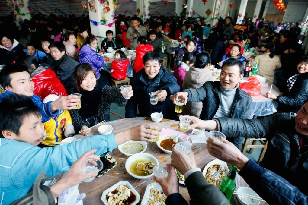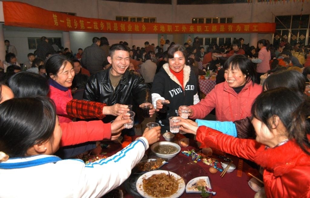 2011年2月2日,浙江諸暨一家公司準(zhǔn)備了豐盛的年夜飯,招待800多名沒有回家過年的員工及其家屬,歡聚一堂共迎新年。