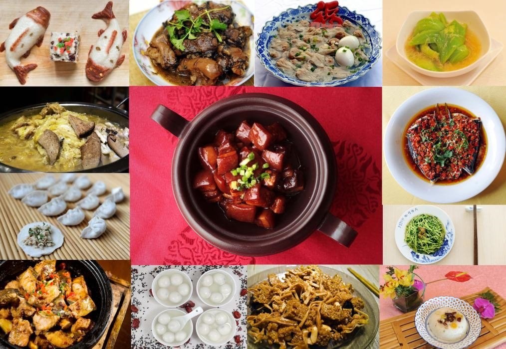 2014年拍攝的拼版照片:“一桌年夜飯”,依次為年糕、發(fā)菜豬手、扁肉燕、長年菜、殺豬菜、餃子、紅燒肉、鴻運(yùn)當(dāng)頭、安豆苗、臭鱖魚、湯圓、四喜烤麩、八寶飯(從左至右、從上至下)。