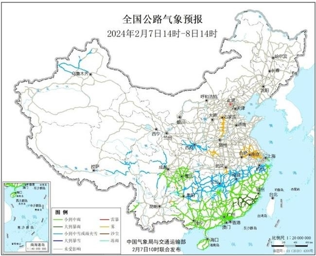 預(yù)計2月7日下午至8日下午,新疆西北部、青藏高原東部、川西高原北部和中部、貴州西部和東部、湖南北部和中部、江西北部、浙江北部等地部分地區(qū)有小到中雪或雨夾雪;貴州西部、湖南中部等局地有凍雨;江西東南部、福建南部等地部分地區(qū)有大雨。另外,河北南部、河南北部和西南部、江蘇西南部、安徽東部、湖北東南部等地部分道路受霧影響能見度低(見圖3,附件1)。