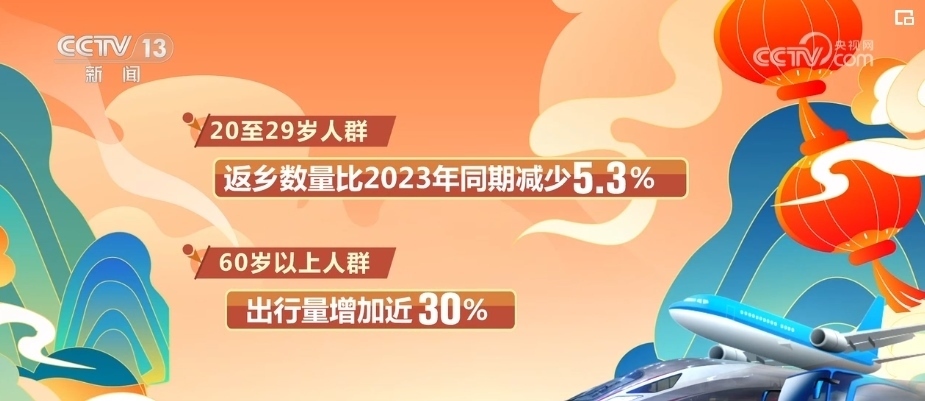 根據(jù)中國(guó)聯(lián)通智慧足跡對(duì)出行人群年齡的分析,2024年“反向春運(yùn)”成為新趨勢(shì)。數(shù)據(jù)顯示,20歲—29歲人群的返鄉(xiāng)數(shù)量比2023年同期減少了5.3%,而60歲以上人群的出行量卻增加了近30%。