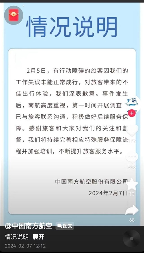 ·網(wǎng)友稱成功申請坐輪椅獨飛后遭拒載,南航道歉:工作失誤致旅客未能正常成行。