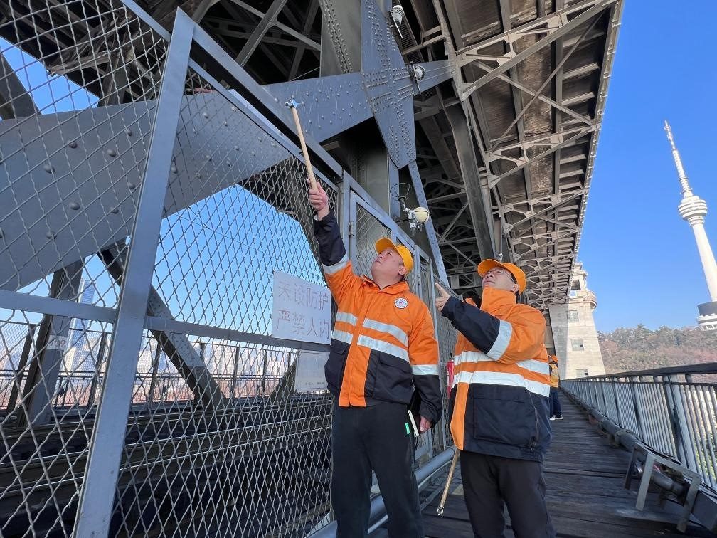 2月12日,武漢長江大橋橋梁車間員工陳卿明(左)、趙福武在武漢長江大橋上巡檢。(朱叢蓓 攝)