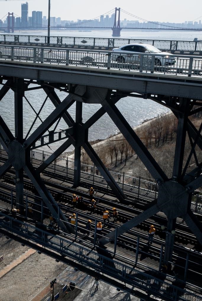 農(nóng)歷大年初三,湖北武漢陽光明媚?!叭f里長江第一橋”——武漢長江大橋宛若一條巨龍飛架于江水之上,氣勢恢宏。身穿工作服的陳卿明和同事,低頭、彎腰,循著大橋鐵道仔細(xì)地檢視鋼梁、枕木。