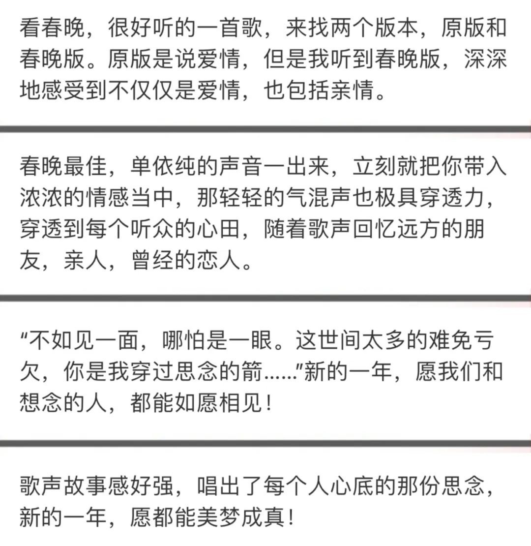 早在節(jié)目策劃階段,總臺臺長慎海雄就向導演組推薦了這首歌,認為它兼具“人民性”與“意境美”,并要求在歌詞和舞美設計上“全新打造”。于是,導演組調整了歌詞,在原版的基礎上擴大意指范圍,讓歌曲展現(xiàn)“人與人之間更廣泛的思念”。