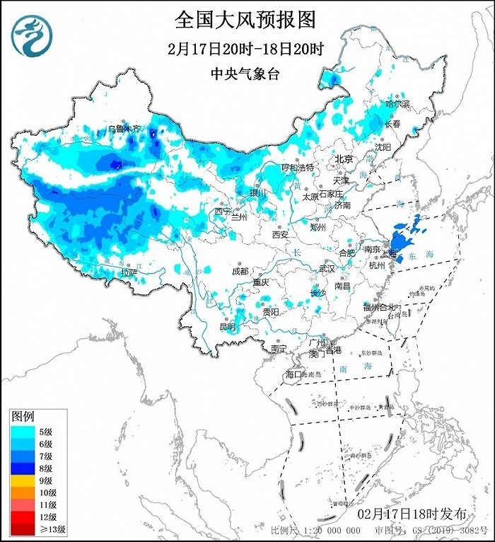 預(yù)計(jì),2月17日20時(shí)至18日20時(shí),新疆北疆東部和南疆盆地、西藏中西部、青海西部和北部、甘肅河西、內(nèi)蒙古中西部、吉林西部等地將有5~7級(jí)、陣風(fēng)8~9級(jí)的大風(fēng)。