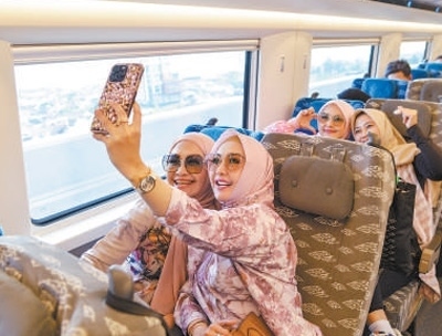 乘客在行駛中的雅萬高鐵車廂內(nèi)拍照。作為“一帶一路”倡議和中印尼兩國務(wù)實合作的標(biāo)志性項目,雅萬高鐵全線采用中國技術(shù)、中國標(biāo)準(zhǔn)。新華社記者 徐 欽攝