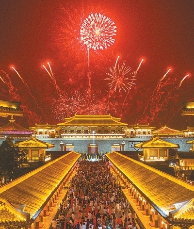 游客們在湖北省襄陽市唐城景區(qū)看煙花秀。當(dāng)?shù)嘏e辦的戲曲文化藝術(shù)節(jié)吸引了眾多省內(nèi)外游客前來,拉動當(dāng)?shù)芈糜谓?jīng)濟(jì)。據(jù)統(tǒng)計,2023年國內(nèi)出游人次達(dá)48.91億,國內(nèi)游客出游總花費4.91萬億元。楊 東攝(影像中國)
