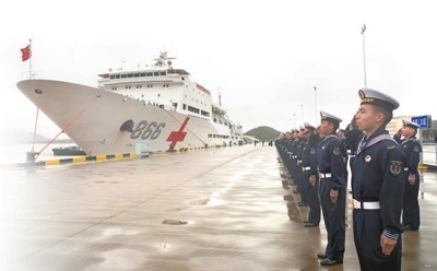 執(zhí)行“和諧使命—2022”任務(wù)的中國海軍“和平方舟”號醫(yī)院船返回浙江舟山某軍港,任務(wù)部隊官兵代表在碼頭迎接?!昂推椒街邸碧栣t(yī)院船是我國自主設(shè)計建造的首艘制式遠(yuǎn)洋醫(yī)院船。自2008年入列以來,該船以“和諧使命”任務(wù)為主要載體,多次遠(yuǎn)赴海外開展人道主義醫(yī)療服務(wù)。孫 飛攝(新華社發(fā))