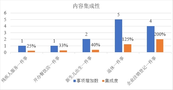 從內(nèi)容集成度看,5項(xiàng)相關(guān)“一件事”的事項(xiàng)集成比例均有不同程度提升?!皻埣踩朔?wù)一件事”增加1個(gè)事項(xiàng),集成度提升25%。“開辦餐飲店一件事”增加1個(gè)事項(xiàng),集成度提升33%。“新生兒出生一件事”增加2個(gè)事項(xiàng),集成度提升40%?!巴诵菀患隆痹黾?個(gè)事項(xiàng),集成度提升125%。“企業(yè)注銷登記一件事”增加4個(gè)事項(xiàng),集成度提升200%。