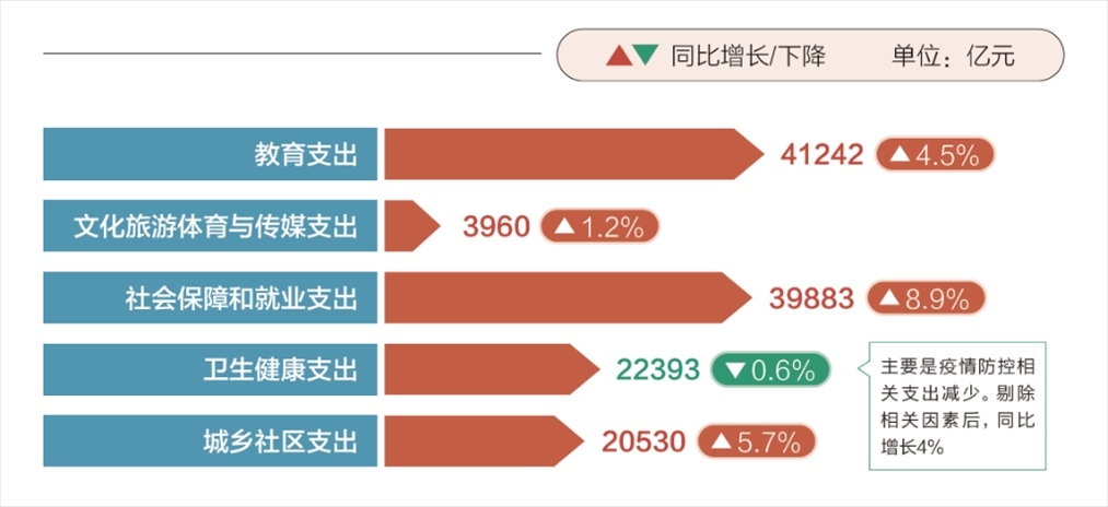 2023年,盡管財(cái)政收支壓力很大,但民生投入力度不減。超過27萬億元全國一般公共預(yù)算支出中,教育、社會保障和就業(yè)支出都在4萬億元上下,衛(wèi)生健康、城鄉(xiāng)社區(qū)支出都超過了2萬億元。