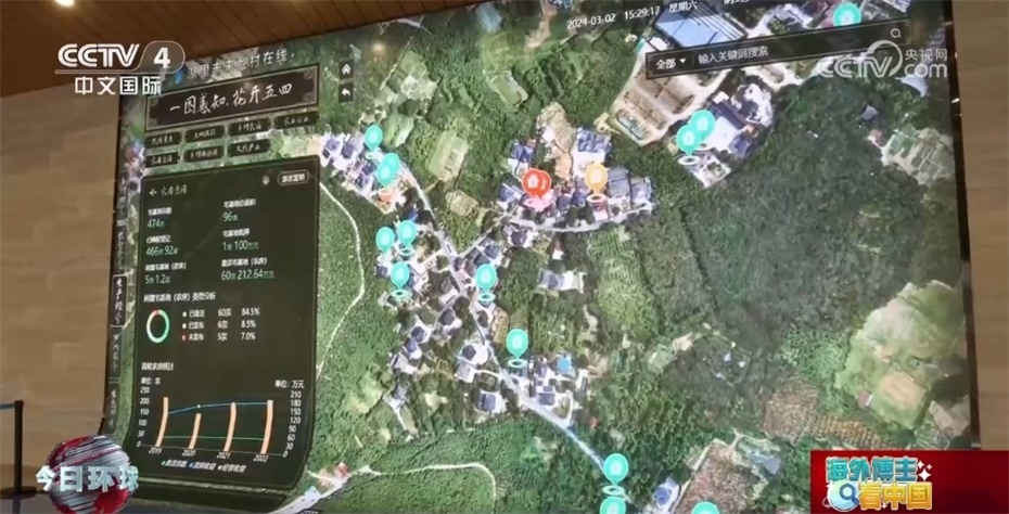 五四村的村干部還帶來了更多驚喜:“帶你去看看我們整個(gè)村的數(shù)字鄉(xiāng)村是如何治理的。整個(gè)一張圖里面所展示的是我們整個(gè)村的發(fā)展。這個(gè)圖是2019年建設(shè)的,也是整個(gè)浙江省在五四村率先打造的‘一圖全面感知’,總共有全縣的各個(gè)部門58個(gè)、282類數(shù)據(jù),總共有12個(gè)這樣的數(shù)據(jù)接口連入到了5個(gè)城市大腦應(yīng)用,形成了這樣一個(gè)時(shí)時(shí)可以感知農(nóng)村的生產(chǎn)、生活、生態(tài)詳情的數(shù)字化體系。”