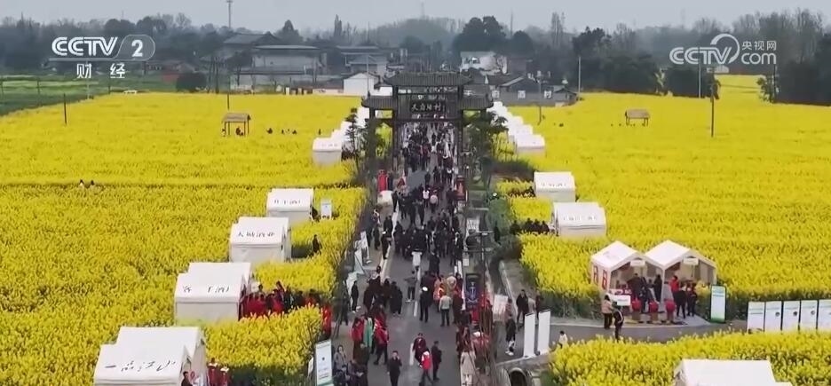 除了“花田火鍋”,在以油菜花田為背景的鄉(xiāng)村道路上,各類裝滿當(dāng)?shù)靥厣r(nóng)產(chǎn)品的攤位依次擺開。游客們迎著花香趕大集,帶走春日特有的伴手禮。