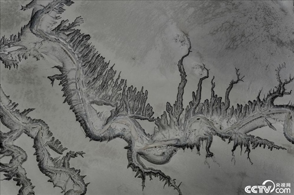 浙江嘉興海寧黃灣鎮(zhèn),錢(qián)塘江退潮后出現(xiàn)騰飛的“潮汐巨龍”。
