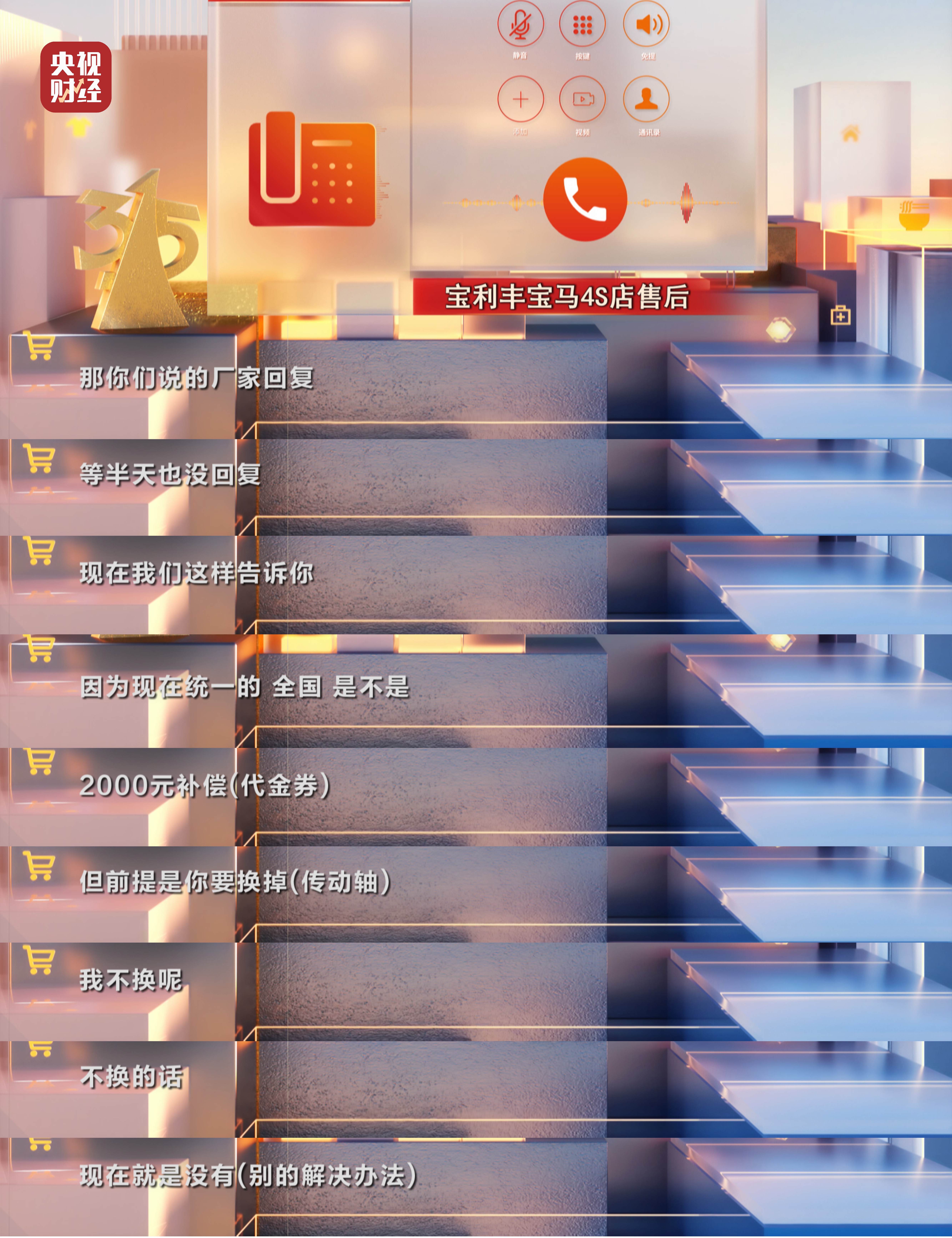 傳動(dòng)軸,是汽車動(dòng)力總成中重要部件,剛買的新車就要更換傳動(dòng)軸,等同于新車要?jiǎng)觽€(gè)“特大手術(shù)”,李先生堅(jiān)決不同意。在與4S店多次交涉無(wú)果后,無(wú)奈之下,李先生撥通了寶馬廠家的客服電話??头藛T的回答讓李先生的心涼了半截。