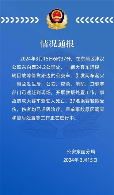 ·天津一輛大客車追尾一輛因故障??柯愤叺墓卉?,引發(fā)兩車起火,事故造成大客車駕駛?cè)怂劳觥?7名乘客輕微受傷。