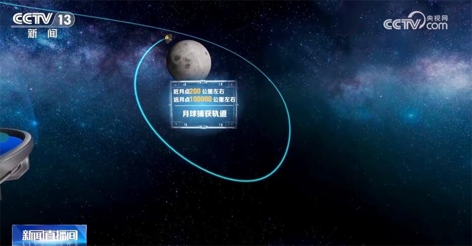 現(xiàn)在,鵲橋二號(hào)正在剎車!看,鵲橋二號(hào)被月球引力捕獲了!現(xiàn)在,它順利進(jìn)入了離月球最近點(diǎn)200公里、最遠(yuǎn)點(diǎn)10萬(wàn)公里左右的月球軌道。